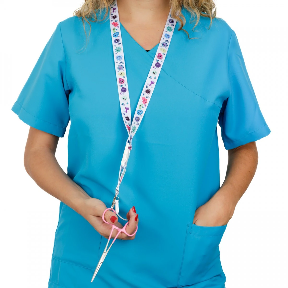 1. Lanyard de cinta plana, con clip de seguridad plano en la nuca. Se desabrocha automáticamente con un tirón, para evitar tracciones en el cuello.