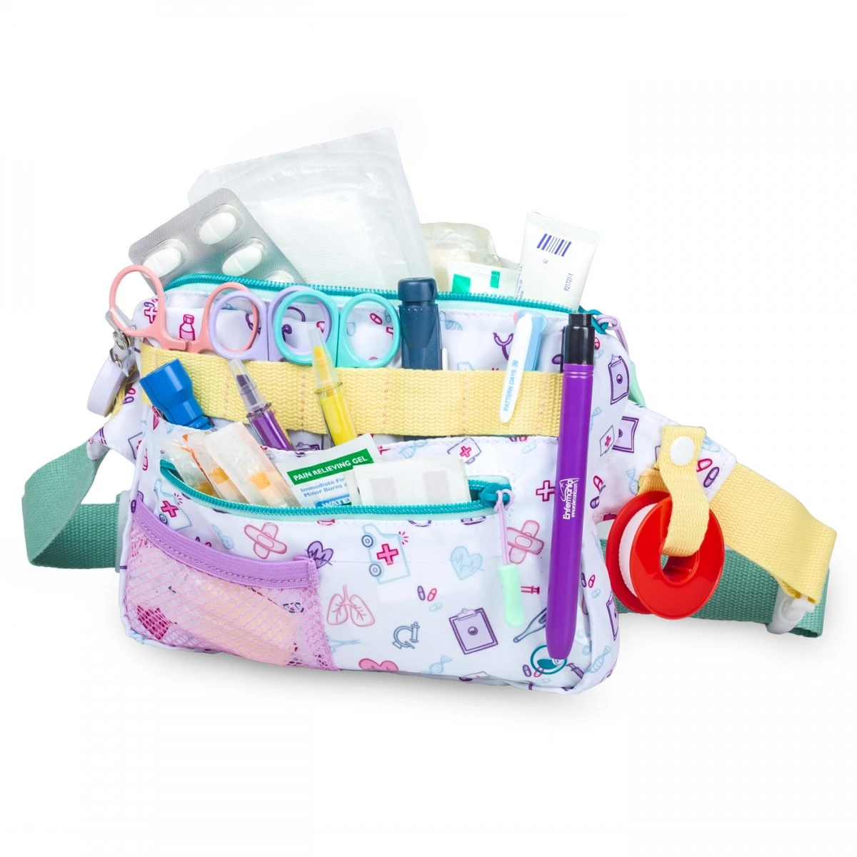 Dispone de dos bolsillos con cremallera, de los que no se te escapará nada y dos sin cremallera junto un panel con gomas, que sujetarán tus bolis, tijeras, tarjetas y tus ganas de ser la mejor combinada del hospi. Así como un panel de plástico frontal para poder aprovechar todo el espacio posible y que no pases eternidades buscando tus pertenencias por las habitaciones.
